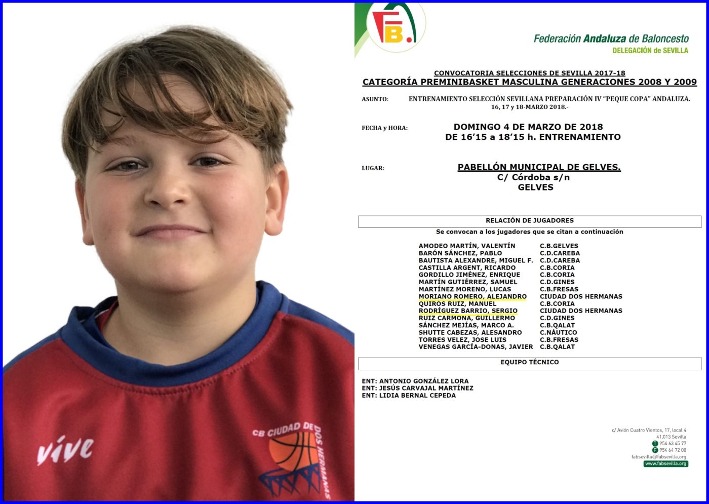 Alejandro Moriano convocado por la selección sevillana de baloncesto en la categoría de preminibasket.